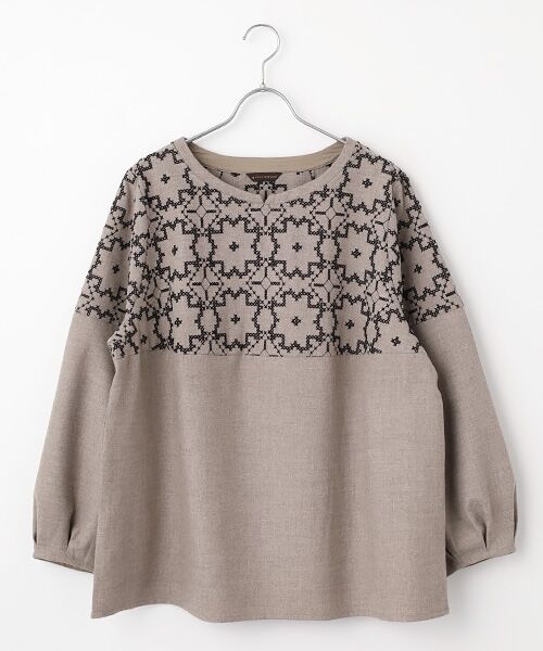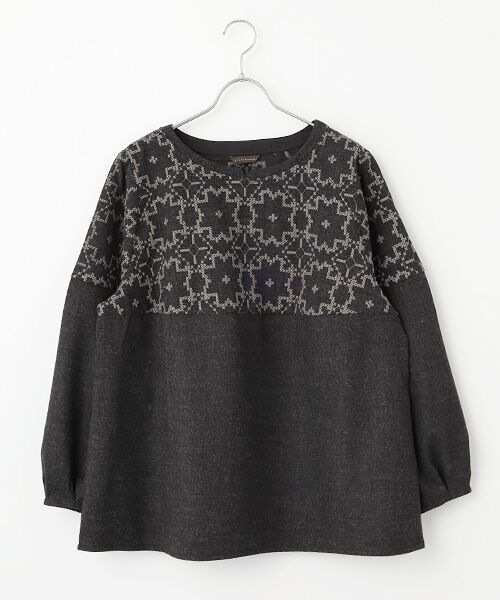 ウールの様に見えるレーヨンポリエステルの起毛素材を使用。クロスステッチの刺繍を施した生地をパーツで使い分けメリハリを付けています。刺繍糸は綿太番の配色糸を使用しているので、立体感とナチュラル感があります。身頃ヨーク部分と肩部分に刺繍生地を使用。肩部分をキュッと引き締めて見せてくれます。背中が綺麗に見えるよう切り替え部分で少しだけ絞っています。