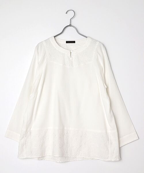表面がさたりとして綺麗なコットンビエラを使用。オリジナルの刺繍を施した生地を部分的に使用し全体にメリハリを付けました。ヨーク、裾、袖口裏に刺繍入りの生地を使用しました。袖口を折り返してちらっと見せてもポイントになります。小さめな肩で華奢見え効果。Aラインの裾が綺麗に見えるように刺繍の分量に拘りました。