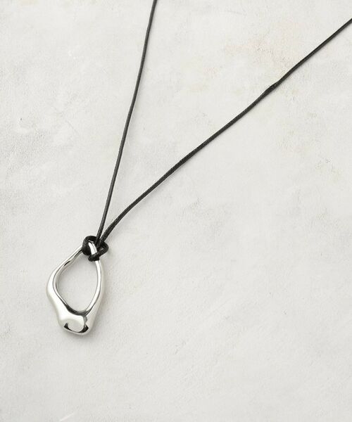 変形デザインのオーバル型メタルチャームをコードネックレスに仕上げたアイテム。