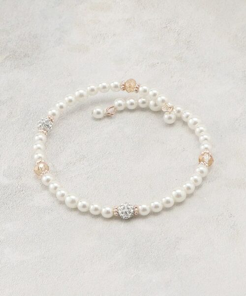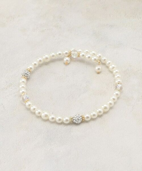 上品なフェイクパールが連なったこのブレスレットは、キラリと輝くビーズがあしらわれており、手首に華やかなアクセントを加えています。