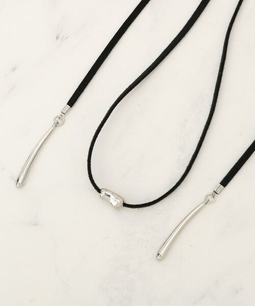 フェイクスエードのリボンにメタルパーツを配したチョーカータイプのネックレス。