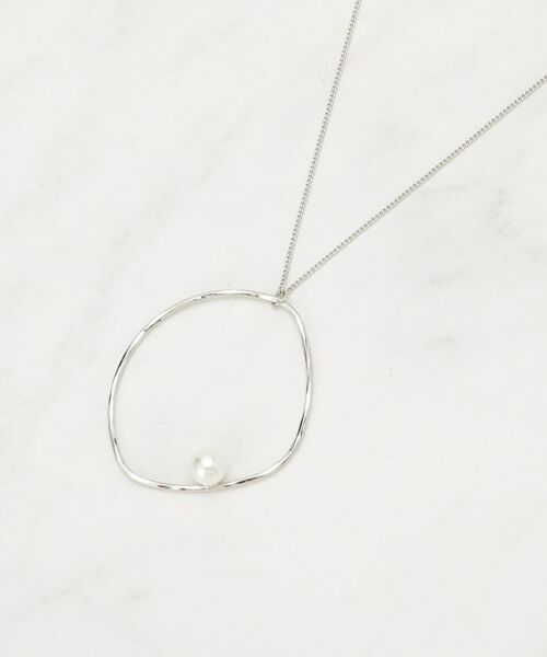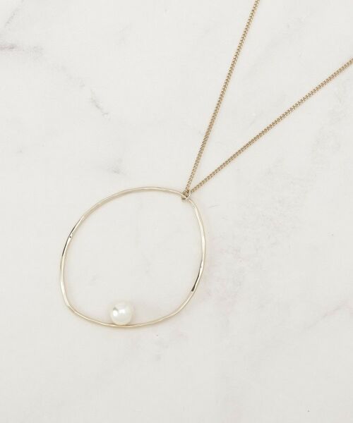 ニュアンスのあるデザインのオーバル型のメタルリングに、上品なフェイクパールをデザインしたネックレス。