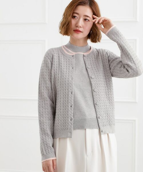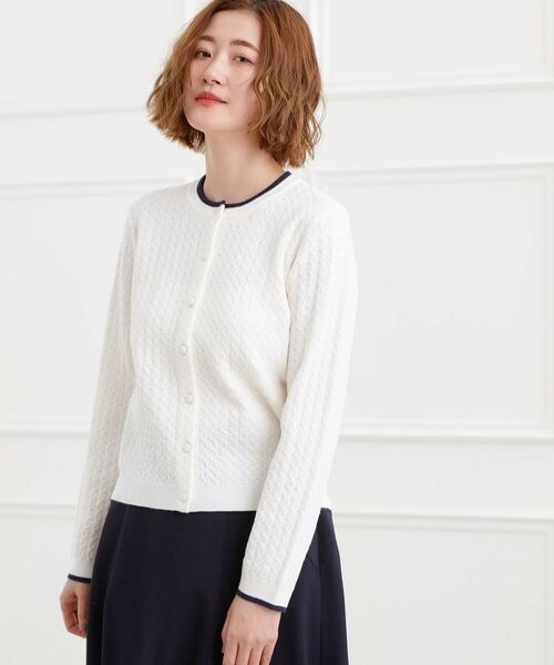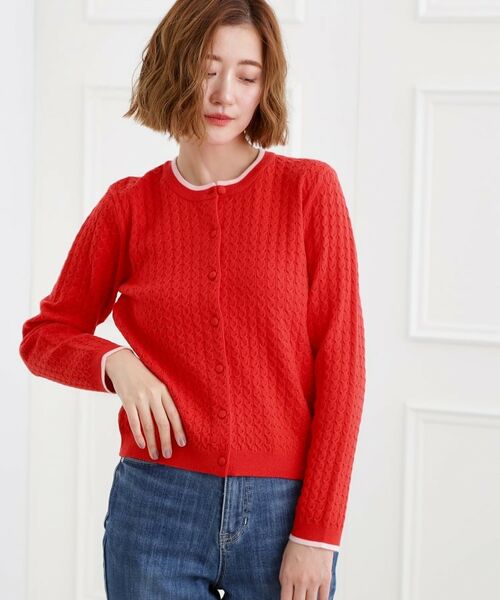 ミニケーブル編みがクラシカルなクルーネックカーディガンです。