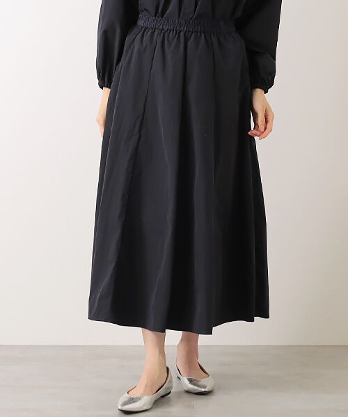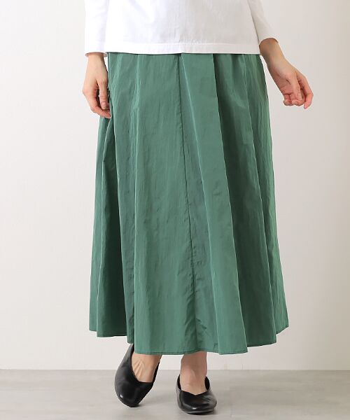 裾広がりのパーツを接ぎ合わせ、ウエスト部分のふくらみを抑えつつ、裾にボリュームをもたせてシルエットに華やかさを出しています。ウエストぐるりゴム入りで楽な着用感。軽くラフ感があり肌離れの良い素材感は着心地抜群です。前後で切替デザインを変えたFB251-03012とセットアップ着用可能