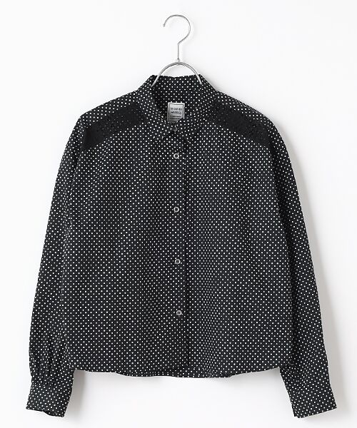 着丈のグッと短いレギュラーカラーシャツは、肩ヨークの前後にレースを挟み込んでいます。甘すぎないレースの柄と、肌が見え隠れする透け感がカジュアルシャツに色気を足してくれています。