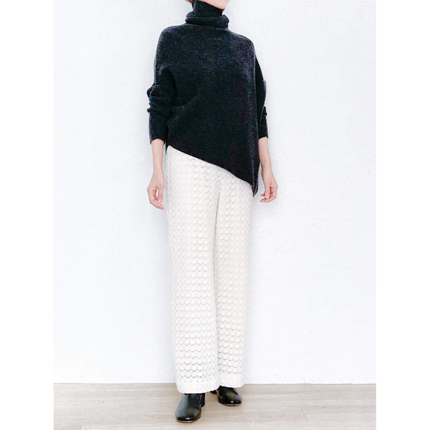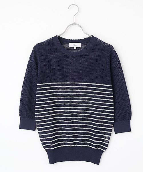 コンパクトなバランスと、甘過ぎない2種類の透かし編み柄のコンビが特徴。ボリューム感のあるボトムと相性がよく、どことなくスポーティーでフェミニンなスタイリングにおすすめ。 端のスカラップ編みがポイント。ボーダーと無地での展開です。