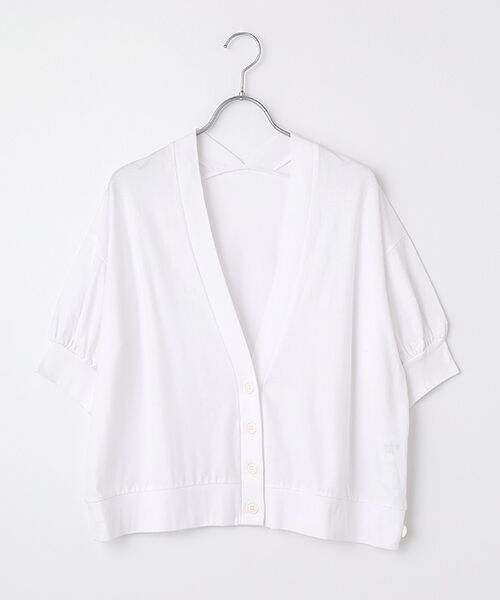 衿を抜いたように自然に後ろが下がる特殊なパターンメイクです。ゆったりした半袖のカーディガンは夏の羽織としてもとても便利ですし、裾のアジャストボタンでカシュクールとしても着用できるので1枚着としても活躍してくれます。使用生地のビヨンド強撚天竺は肌に優しいコットンを強撚仕上げにし、サラッと涼しげな風合いの天竺に編み上げました。強撚にすることで肌離れが良く、暑い季節でもサラッと涼しく快適に過ごせる素材に仕上げています。発色の良さも魅力です。