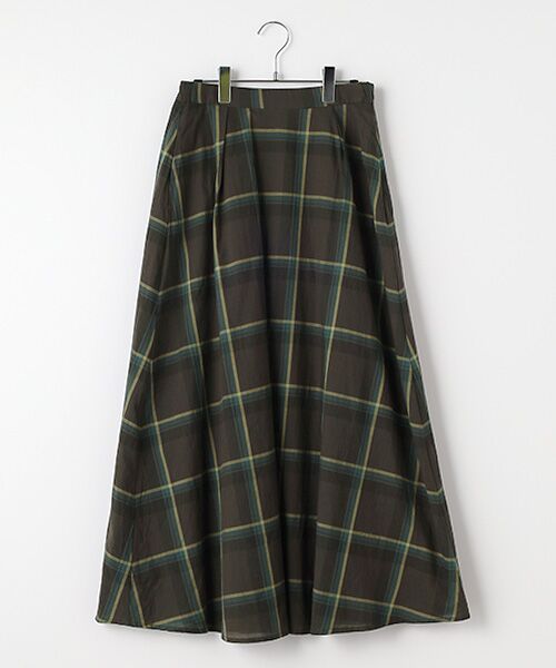 前後それぞれ1枚のパーツで取ったフレアースカートです。そのためチェックの柄が中心から傍に向かって下がっていくように見え、前身タック・後身ギャザーと併せ柄を少し崩すことで生まれる抜け感と奥行き感を出してあります。後ウエストはALLゴムなので大変はきやすいスカートです。同素材のブラウスとのセットアップ着用もおススメです。使用生地は天然繊維の優しいタッチが心地良いチェック素材です。薄手で軽くソフトな風合いです。程よい透け感がありシックなカラーにもカラフルで元気なカラーにもよく合います