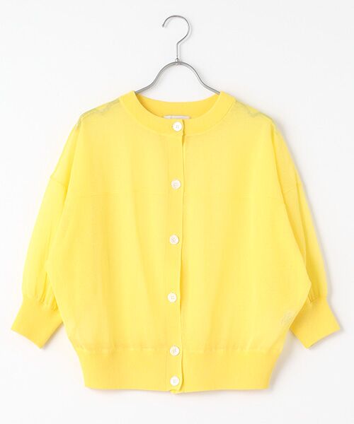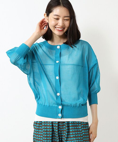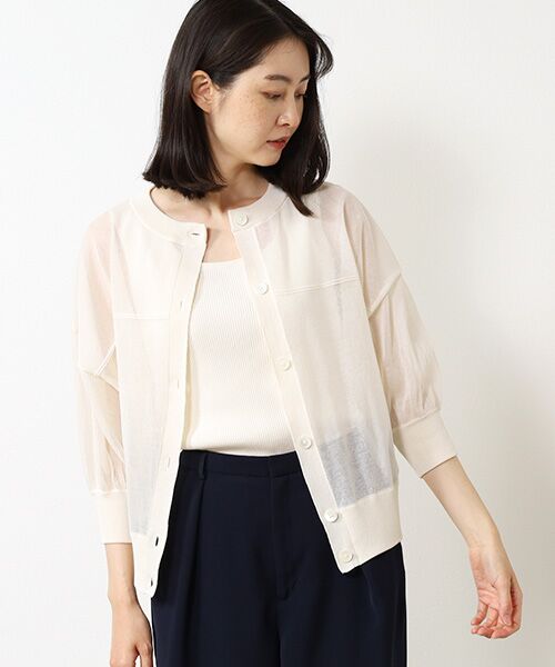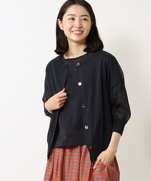 清涼感のあるシアーな編地のカーディガン。薄手ながら程よくハリ感のある編地は肌離れもよく風通しのよさを感じます。ゆったりとしたサイズ感とコンパクトな丈感で羽織としても1枚着としても着やすいバランスです。ポリエステル混コットンで清涼感と天然素材の肌触りのよさが特徴。