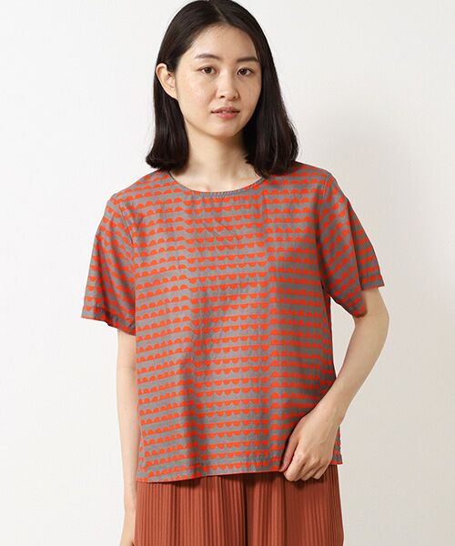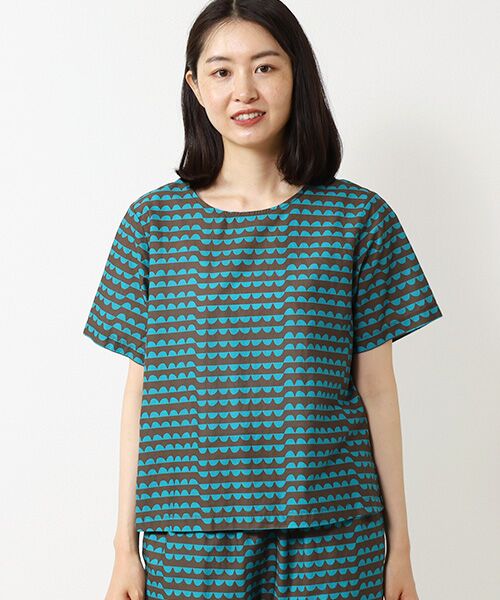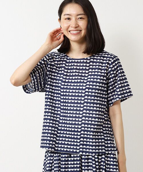 Tシャツ感覚で着られる半袖ブラウス。 程よくゆとりのあるサイズ感でコンパクト過ぎずにお召しいただけます。ボリュームのあるボトムと好相性。薄手で暑い時期に重宝し、アクセントになるオリジナルのプリントがコーディネートを華やかに仕上げます。綿麻混のパンツとのカジュアルな着こなしや、同素材のスカートとのセットアップでワンピースのような着こなしもおすすめ。暑い日でも爽やかにきていただける薄手のコットン100%の素材。ただのボーダー柄ではなく波のようなフリルのような柄が繰り返したユーモアのあるプリントに仕上げました。