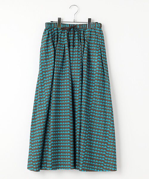 ボリューム感が着映えするスカート。薄手なのでこの分量感でも軽量で暑い時期でも爽やかにお召しいただけます。ウエストのタックをステッチで押さえる事でお腹周りがもたつかずにスッキリとさせています。ウエストは総ゴム+リボンでリラックスした履き心地。アクセントになるオリジナルのプリントがコーディネートを華やかに仕上げます。シンプルな無地アイテムはもちろん、同素材のブラウスとのセットアップでワンピースのような着こなしもおすすめ。暑い日でも爽やかにきていただける薄手のコットン100%の素材。ただのボーダー柄ではなく波のようなフリルのような柄が繰り返したユーモアのあるプリントに仕上げました。