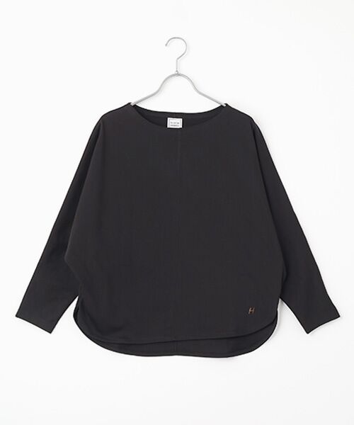 シンプルな無地のバスクシャツはドルマンスリーブにすることで肩周りのシルエットがとても優しげで女性らしい見え掛です。裾にはシックな配色の"H"刺繍を施しカジュアル感をトッピング、シャツテールと併せて優しい雰囲気を醸し出します。
