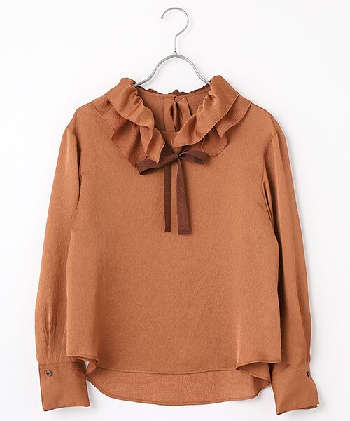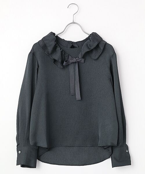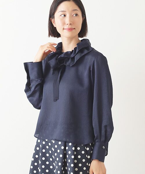 素材の風合いと表情を生かしたニュアンスのあるブラウス。FP252-04007との大人っぽい抜け感のあるセットアップスタイルもおすすめ。グログランテープリボンと同素材ラッフルを組み合わせた立体感のあるストールがキッチュな雰囲気をプラス。使用生地はソフトな風合いで、サッカーの凹凸感と絞感が表面の光沢感に陰影をつくり、大人っぽいニュアンスがあります。