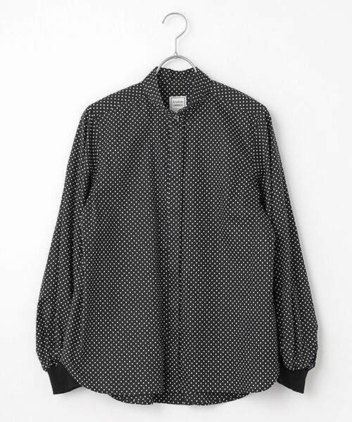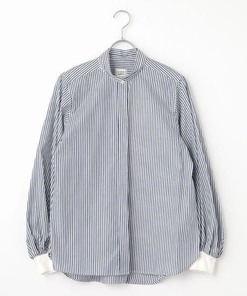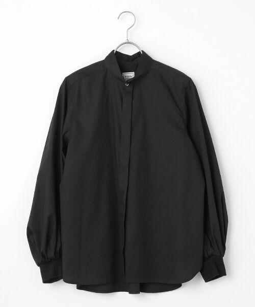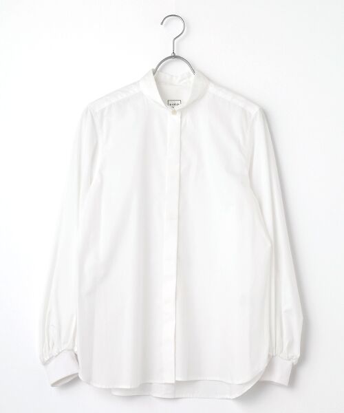 シンプルなフライフロントのシャツは定番のミニカラーで仕立てています。ジャストサイズの肩から胸周り、裾に向かって緩やかに広がるAラインシルエットが素敵です。袖はカフス上にタック&ギャザーによって分量をしっかりと出し、リブのカフスでキュッと絞りました。新鮮なサイズ感に仕上がっています。