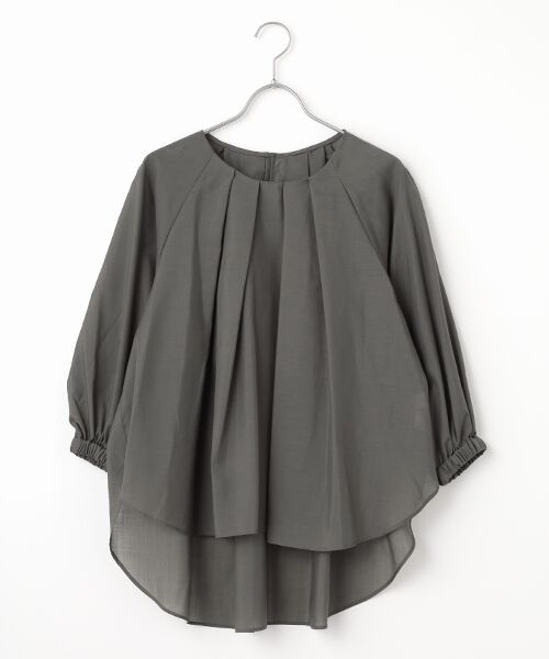 コンパクトなノーカラーとタックフレアによるゆったりとした身頃は、シックな雰囲気がありつつ風通し良がよく涼しげ。深めの脇スリット、ラウンドカットの裾ライン、しっかりと差寸をつけた着丈バランスなど、高温が続く晩夏初秋の抜け感のあるスタイルにおすすめのブラウス。使用生地の綿ライク ポリエステルローンは薄手のポリエステルローンにコットンライク加工を施しナチュラルでこなれ感がありつつイージーケアな素材。猛暑が長引く晩夏初秋におすすめ。