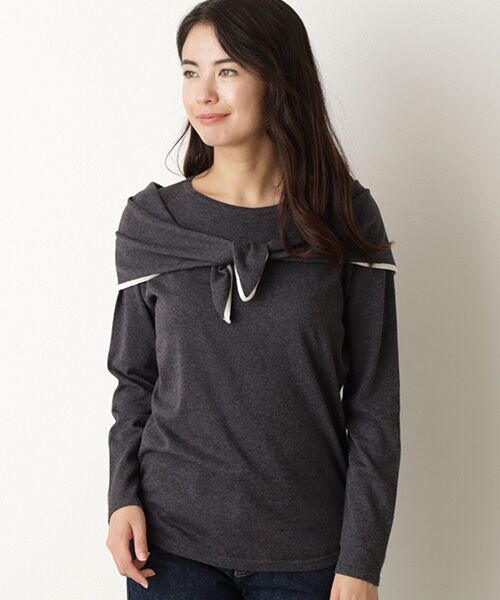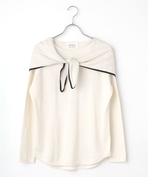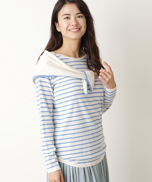同素材スカーフが付いた、16G天竺薄手のプルオーバー。身頃はゆったりとし裾に向かい細くし、腰にクシュと沿ったシルエットです。スカーフは配色トリミング、単品としてもお使いいただけます。爽やかなカラーの無地3色とボーダー2色の展開になります。ソフトなタッチの綿糸にカシミヤをブレンドしています。爽やかなコットンに加えて、カシミヤの暖かさをプラスしシーズン通して着て頂ける素材です。