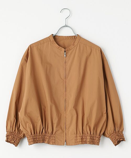 ドルマンスリーブのゆったりとしたサイズ感。裾はゴム入りブラウジング仕様でコンパクトな丈感。細めのスタンドカラーとオープンファスナーあきのシャツディティールがクリーンなカジュアル感。羽織れるブルゾン風シャツ。同素材のパンツとのセットアップ着用もおススメ。使用生地のタイプライターはナチュラル感のあるソフトな風合いと適度なハリ感が特徴。ハイカウントの綿100%素材。