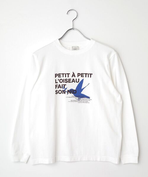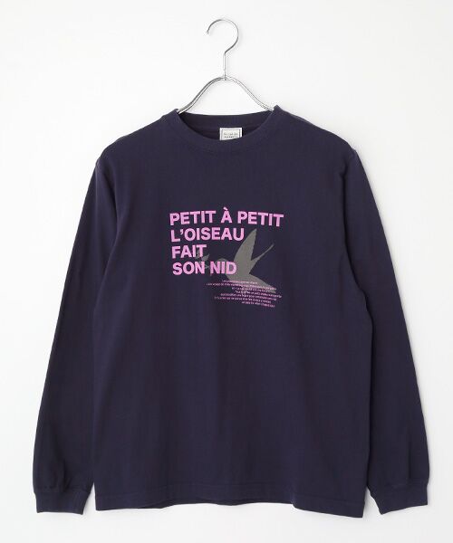 程よいゆとりのベーシックカフ付きロンT。太いロゴは「鳥は少しずつ巣を作る(直訳)」、「千里の道も一歩からのフランス版の諺で、小さい文字部分はその説明が書いてあります。」「よれない・透けない・長持ちする」といった三拍子がそろった上質なTシャツです。丈夫な衿元を実現するため、首回りの縫製に「ダブルステッチ」を採用。長年愛用いただいてもきちんとした首回りを保ちます。