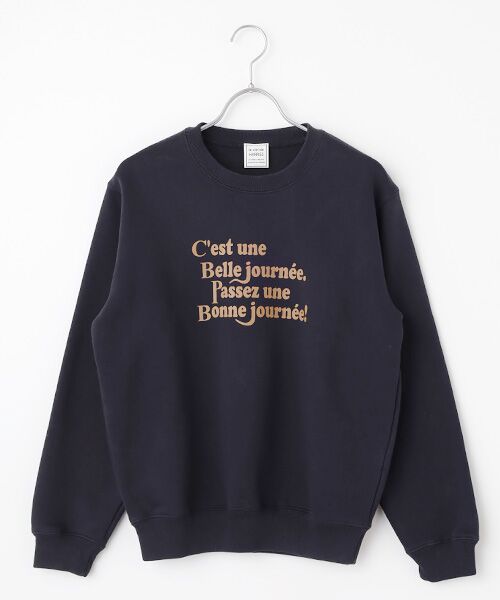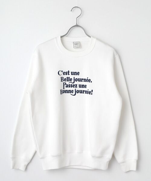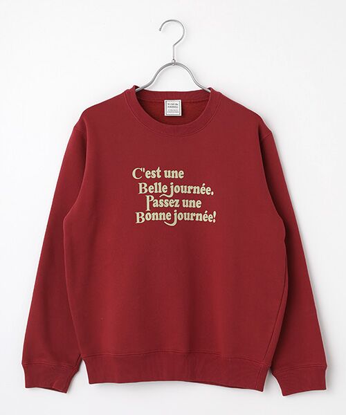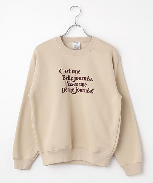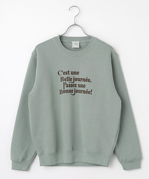 若干大きめにセットしたボディーのとてもベーシックなスウェットシャツです。胸には変形フォントで「いい天気!良い1日を!」と書いてあります。表面を綿100%で組成してあり裏地はふかふかで保温性の高い裏起毛にしながら、T/C(綿×ポリエステル)の生地にすることで軽くて丈夫なスウェットに仕上げました。繊維が毛羽立つことで空気を含み保温性が高く、手ざわりはふんわりとやわらかに。保湿性・防寒性ともに高くなります。