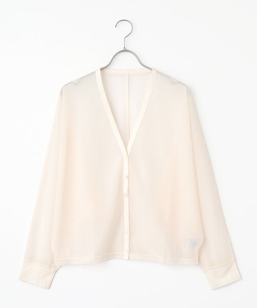 AHの切り替えのないドルマンスリーブのVカーディガンです。肩から袖口へのボリューム感と切り替えの無いスッキリとした見え掛が大人な1枚です。シアー感ある素材なので見た目にも涼しげでコーディネイトに深みと女性らしさを足してくれます。程よいシアーのある繊細な素材です。糸使いや組織で独特のシボ感を出してあります。