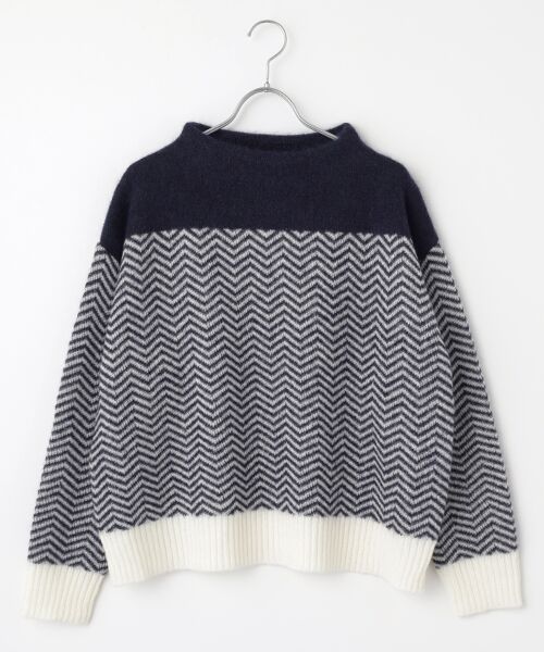 2色等間隔のヘリンボーン柄が爽やかなダブルジャカードです。肩部分は同じ厚さになるよう配慮しながら、バスクシャツにあるような無地部分を作っています。袖口ロスそのリブも無地ですが、肩部分と反対色を使うことで全体の見え掛にリズムが生まれます。軽量感に優れ、滑らかな手触りと上品な光沢のある高級感ある起毛素材です。それに、柔らかでスポンディッシュな風合いのタム糸(ループヤーンを糸で引っかき毛羽立たせた糸)をプレーティングすることでふんわりと温かみがある嵩高の編み地をつくりました。