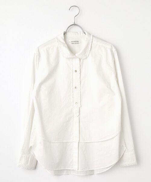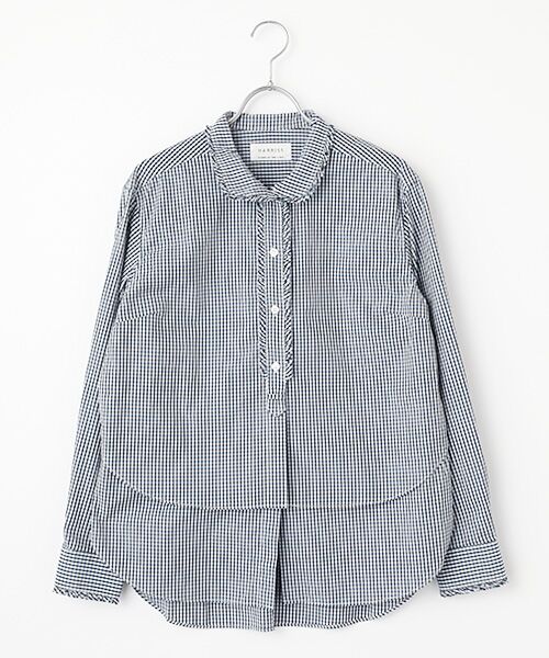 共地の小さなフリルはバイヤスにカットした仕様、前身頃を二段にし、下の長い裾をイン、ショート丈シャツ見えにもと2wayで楽しんでいただけます。色展開は白無地・ピンストライプ・マルチギンガムの柄展開、ナチュラル見えのワッシャー仕上げです。 甘撚りのソフトな平織物、ラフなナチュラルさを表現した素材です。