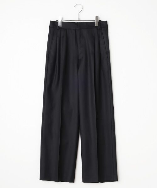 脇近気味に深めのタックを取りれた、メンズライクなストレートシルエット。同素材ジャケットとセットアップもお薦め。ウエストは後ろ中心部分ゴム、前膝裏付の仕様です。2/60の糸を使用し、通常よりタテ糸本数を増やし生地に貼り感を付けシャープな印象に仕上げています。ジャパンメイド、尾州生産のクオリティの高いフラノ素材です。