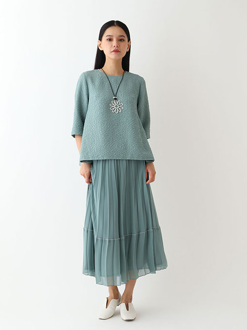 ポコポコと凹凸感のあるふくれジャカードで仕立てた優しい風合いが特徴的。脇下にちらりと見えるシフォンプリーツが大人フェミニンなアクセント。ゆったりとしたワイドフォルムでカジュアルスタイルにも合わせて頂ける一枚です。同じシフォン素材のプリーツスカート【RBHIW42260】と合わせた夏のレディスタイルもおすすめ。同素材のチュニック【RBBIW41290】もございます。※バックボタン
