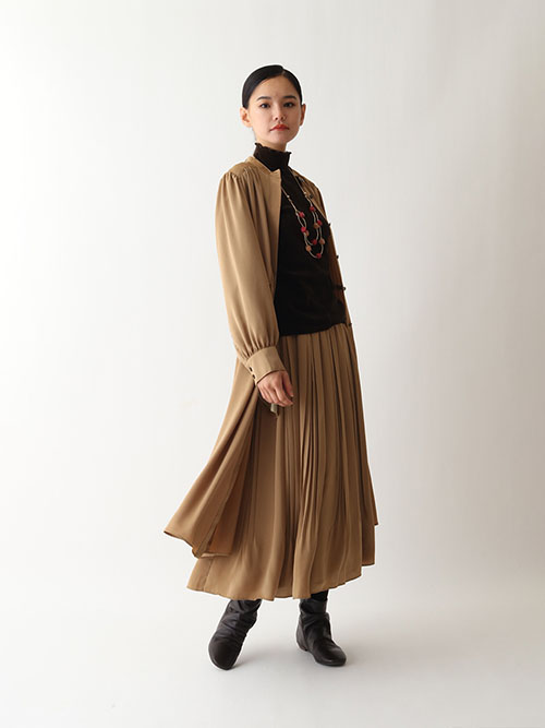 フロントはバンドカラーに比翼仕立てですっきりと仕上げ、肩ヨーク、ウエストと袖山に施したギャザーがフェミニン感のあるデザインです。ウエストはストレッチコード仕様でアジャスト出来るのも嬉しいポイント。リラクシーな着用感ながらも美しいドレープシルエットが秋のシーズンスタイルに映えるおすすめの一枚です。同素材のスカート【RBHLW21270】もございます。