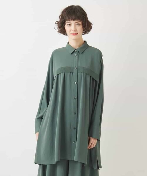 トーンを合わせて統一感がありつつ異素材合わせで立体感を出したオリジナリティのあるブラウス。胸元の切り替えにリブアクセントを加え、ギャザーからふんわりと広がるフレアヘムが女性らしさもあるデザインです。ボトムスタイルに最適なチュニック丈で落ち感のある素材がすっきり見えを演出。リラクシーな着心地でデイリーユースして頂けるおすすめの一枚です。同素材のパンツ【RBLCB32290】とセットアップもおすすめ。