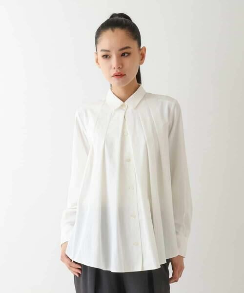 フロントのカット&レイヤードディテールがスタイリッシュなブラウス◆ デザイン・おすすめポイント ◆コンパクトな襟元から放射状に広がるタックデザインがモード感溢れる一着。前後差をつけたヘムラインにバックヨークに入れたタックが動きあるシルエットを演出してくれます。シンプルなボトムに合わせるだけで印象的なスタイリングが決まるおすすめのトップスです。◆ 素材 ◆ポリエステル100%のソフトタイプライター生地に特殊な加工を施し風合い豊かに仕立てました。-----------------------------------透け感 : ややあり伸縮性 : なし光沢感 : なし生地の厚さ : やや薄手-----------------------------------
