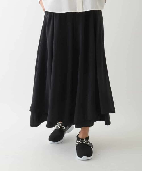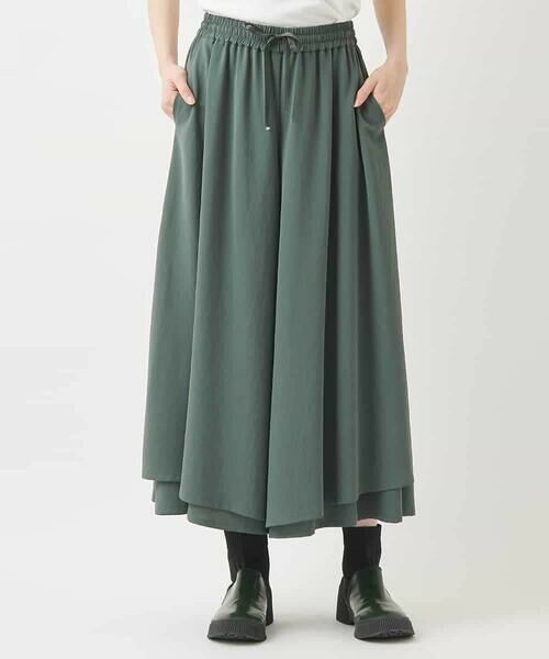 ドライマットなとろみテキスタイルでしなやかな動きを演出するフレアシルエットが特徴です。フロント裾をレイヤード風に仕立た二枚仕立ての立体ディテールがポイント。ウエストゴムに加え、ストリング仕様でリラックス感があるのも嬉しいお作りです。軽やかな着心地でロングシーズンで活躍してくれるおすすめのアイテムです。同素材のブラウス【RBBCB30330】とのセットもおすすめ。