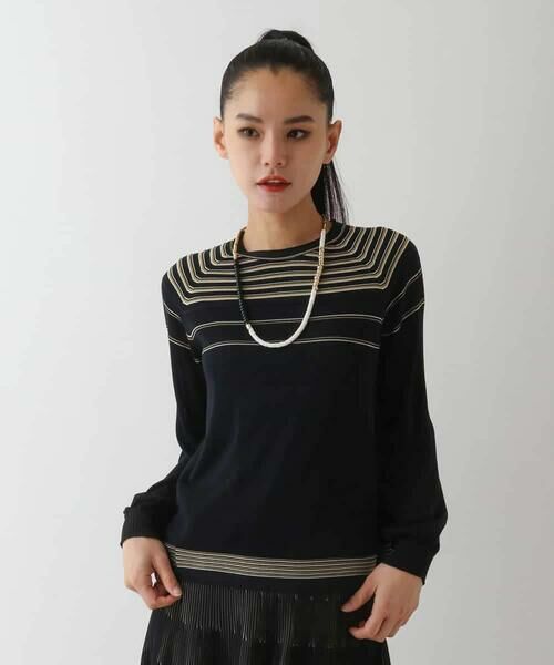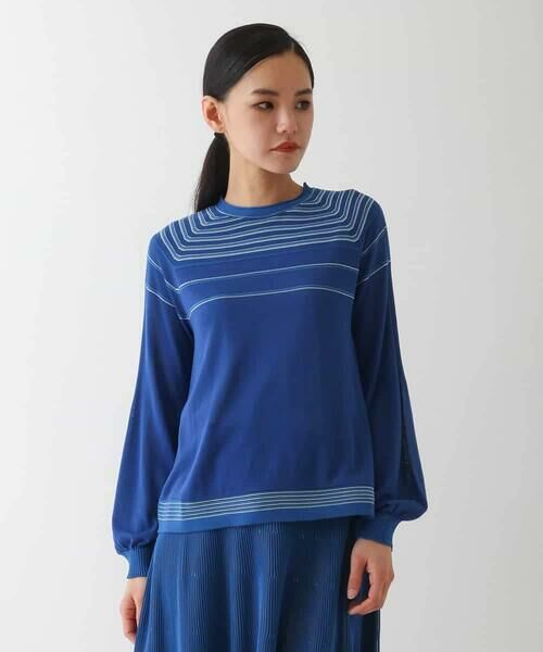 無縫製ならではのノンストレスな着心地で軽やかに仕立た一枚。求心スクエアのボーダーラインやガーター編みで凹凸感をプラスした立体の美しさもポイント。袖ギャザーやヘムラインのシルエットなどさり気ない可愛らしさも魅力です。同素材のニットスカート【RBGDA02270】と合わせたセットアップもおすすめ。