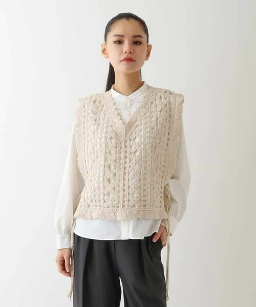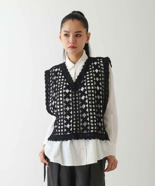 繊細な編地で様々な模様を組み合わせたクラフト感のあるコットンレース仕立て。サイドが開いたスクエアフォルムで身幅を気にせず様々なアイテムと合わせて頂けるお作りです。アレンジ自由なサイドリボン付きで着崩れしにくくほんのり甘さもプラス。インナー次第で様々な印象に変えてくれる今季おすすめのアイテムです。