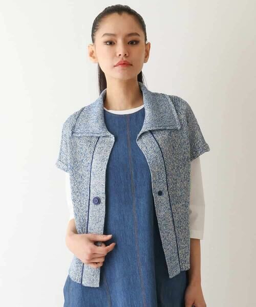 イタリアヤーンの混合糸を使用したシーズナルな抜け感が涼し気なお作り。二色のカラーミックスと表情の異なる編地の使い分けもこだわりのポイントです。コンパクトなフォルムでさっと羽織れるひとつ留めボタン仕様。グログランテープを覗かせたさりげないアクセントにも注目です。Tシャツやドレスにプラスするだけでワンランク上のカジュアルスタイルに。