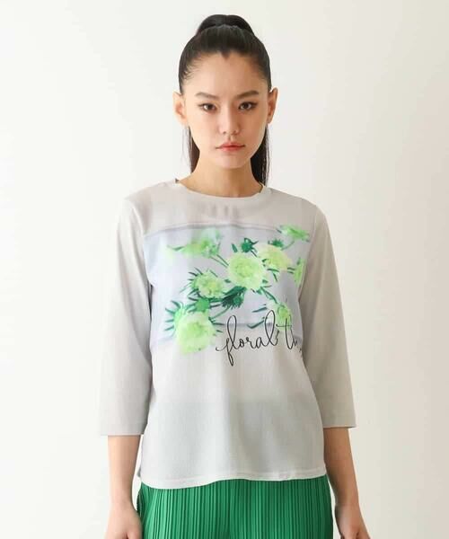 休日の庭園のようなリラックス感をイメージしたニュアンスある花柄転写プリントが印象的。セットインスリーブに七分丈でレイヤードスタイルにも重宝する一枚です。カットソーにサテン、ジョーゼットの異素材をドッキングした表情の違いにも注目。どんなボトムと合わせてもバランス良く着こなして頂ける汎用性の高いアイテムです。同シリーズのチュニック【RBKFB37270】もおすすめ。