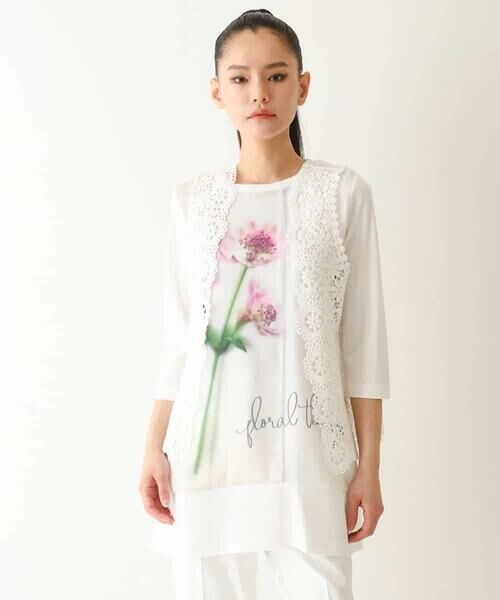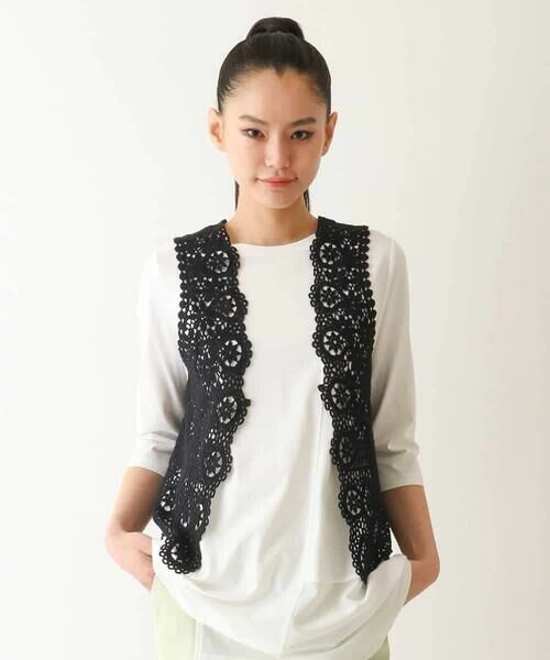 アクセサリー感覚でプラスして頂ける軽やかなジレ◆ デザイン・おすすめポイント ◆ナチュラルなコットンの優しい風合いがシーズナルなスタイリングにぴったりのひと品。フラワー型やドロップモチーフなど繊細な編みディテールを全面に効かせた洒落感たっぷりのデザインです。アームホール長めのコンパクトなフォルムで様々なアイテムと好相性。シンプルなコーディネートにプラスするだけで華やかに魅せてくれる汎用性の高さも魅力です。model:H172 B81 W58 H86 着用サイズ:M◆ 素材 ◆コットン100%の細糸を使用した手の込んだレース仕立て。ドライタッチの軽やかな肌触りです。