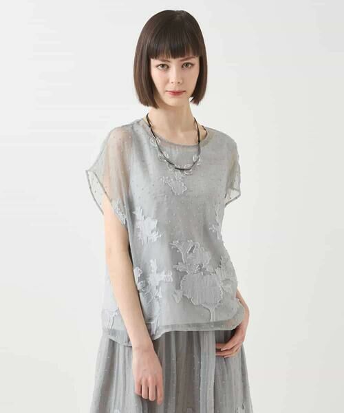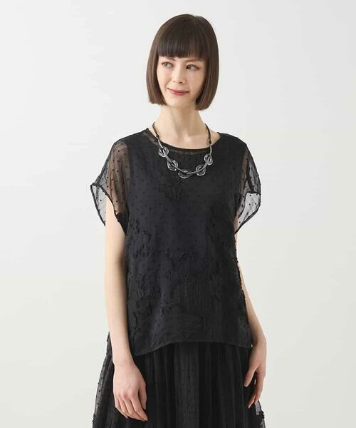 カットディテールの効いたフラワー柄と小付きドットがフェミニンなデザイン。フレンチスリーブのヘルシーな雰囲気と淡いシアーが軽やかに印象付けるコンパクトな一枚です。単品使いはもちろん、同シリーズのスカート【RBHGA31360】と合わせればお呼ばれの席にもぴったりのセットアップに。※バックボタン、インナー付き