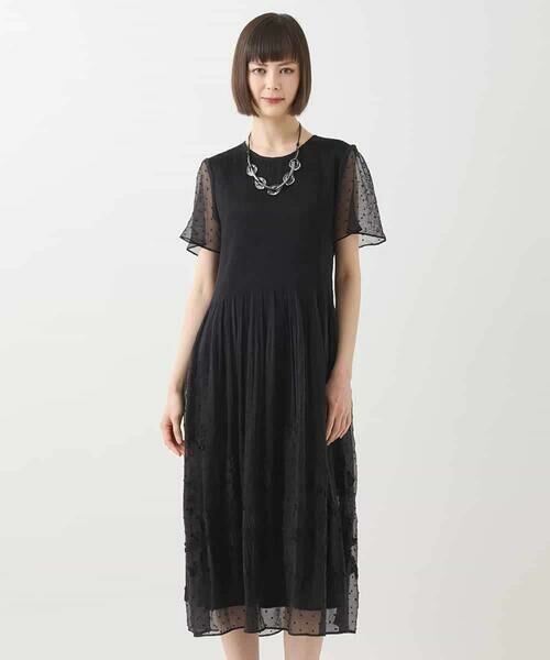上半身は細かなシャーリングでフィット感良く仕上げ、ウエストからふんわりと広がるシルエットが魅力的。上品なドット柄に裾のフラワーモチーフが特別感をプラス。エアリーな袖を合わせた美しいバランスがスタイルアップも叶えてくれるおすすめのアイテムです。同生地を使用したブラウス【RBBGA30390】もございます。※アンダードレス付き