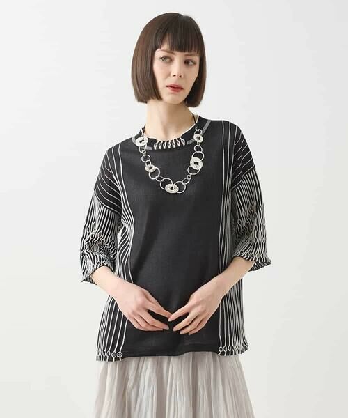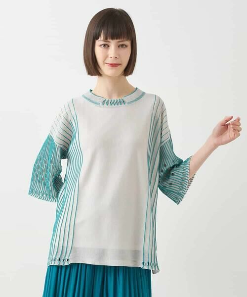 凹凸のある配色ラインとホールアクセントをふんだんに織り交ぜたレーシーな編地が特徴的な一枚。さらりとした清涼感のある軽いお作りで機能面にも優れた特別感あるデザインです。柄入れをサイドに施した細見えシルエットで楽な着心地も嬉しいポイント。大人カジュアルに一枚さらりと合わせて頂ける今季注目のアイテムです。同素材のカーディガン【RBFGA40330】もおすすめ。