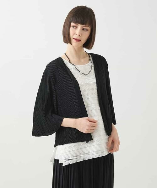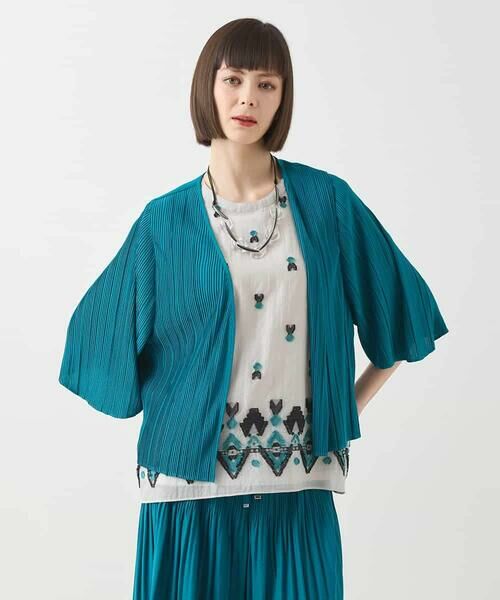 ランダムプリーツのシャープなニュアンスが魅力的なショート丈デザイン。コンパクトなショルダーに幅のあるフレアスリーブがフェミニンなコンビネーションです。ボタンレスで着脱しやすく、エレガントなドレープとソフトな揺れ感が印象的なスタイリングを後押しします。同素材のワンピース【RBPGA02390】やパンツ【RBQGA03330】と合わせたレディなセットアップがおすすめ。