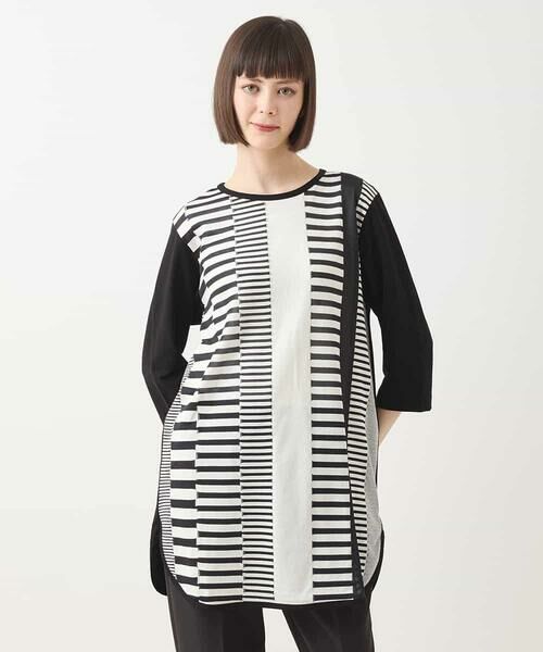 コットンベースで仕立た肌触りにもこだわった優しい着心地が魅力的な一枚。アレンジボーダーとヘリンボーン柄をジャカード織りで表現したモノトーンデザインがインパクトのあるお作りです。柄部分の光沢あるシアーがソフトな抜け感をプラス。コンパクトな袖と丸みのあるヘムラインでカジュアルに合わせて頂けるおすすめのアイテムです。同シリーズのプルオーバー【RBKGA05220】もございます。