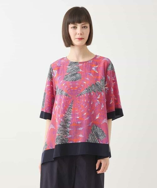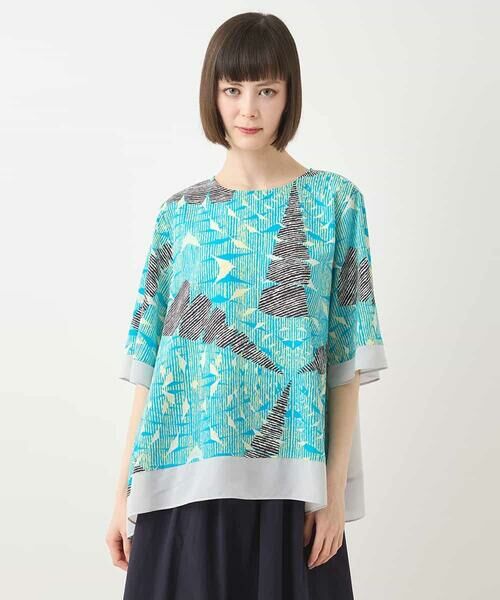 ストライプのタイルのようなクールなデザインがオリジナリティ溢れる一枚。後身に伸縮性あるジャージー生地、袖口や裾には無地のデシン素材をジョイントした異素材MIXも特徴的です。ゆとりあるフレアヘムでエアリーな軽い着心地も魅力的。夏らしい爽やかさで気分も高揚する今季おすすめの一枚です。同デザイン使用のチュニック【RBKGA10270】もおすすめ。