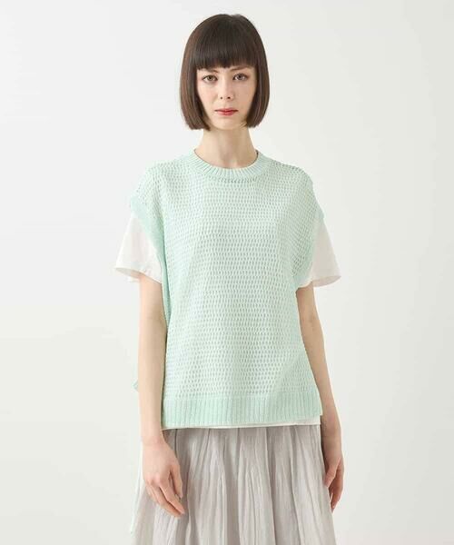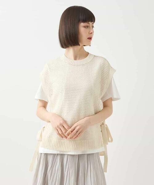 こなれスタイルにブラッシュアップしてくれる人気のニットジレ◆ デザイン・おすすめポイント ◆ナチュラルで爽やかなペーパーヤーンを混紡したシーズナルなお作り。抜け感あるホールメッシュの繊細な編地がソフトにアクセントを加えます。前後差を広くとったヘムラインやサイドのリボンディテールがこだわりのポイント。シンプルなワンツースタイルにプラスするだけでおしゃれ度を上げてくれる汎用性抜群のアイテムです。model:H169 B73 W53 H80 着用サイズ:M◆ 素材 ◆コットン、紙、レーヨンを合わせたさらりとしたニット生地を使用。軽い着用感でインナーを選ばず合わせて頂けます。