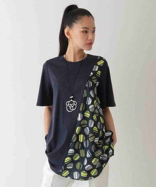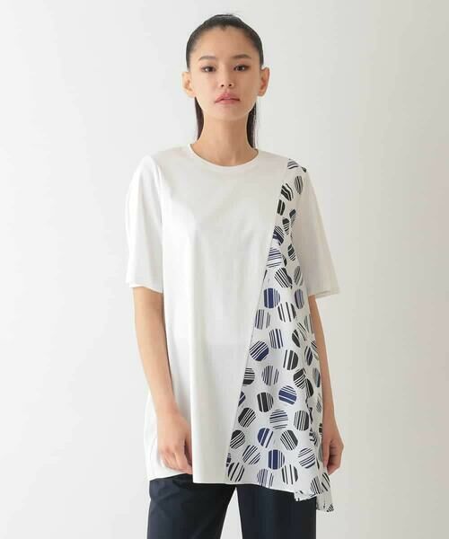 ストライプと大きなドットがアクセントのPOPで明るい雰囲気の配色柄が特徴。バイヤスカットに異素材をジョイントしたエアリーなコンビネーションが魅力的です。サイドを落としたイレギュラーヘムがスタイリングをすっきりとアシスト。コンパクトなパンツと相性の良いチュニック丈で着合わせしやすいのもポイントです。同素材で仕立た違うデザインのカットソー【RBKHA46260】もおすすめ。