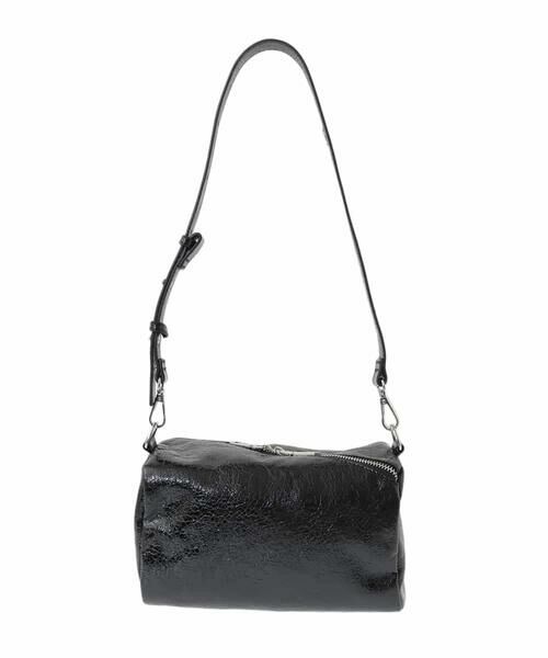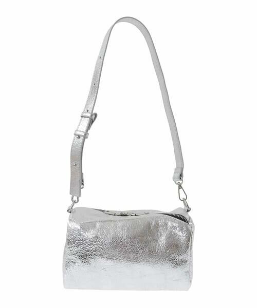 モードに艶めく箔押しデザインがコーディネートに映えるミニボストン。コロンとしたボックスフォルムに斜めのファスナーが洒落感溢れるひと品です。同素材の細めのベルトと配色ラインを効かせたスポーティーな幅広ベルトをお好みで付け替えアレンジが可能。シックなブラックと、メタリックに煌めくシルバーカラーの2色展開です。