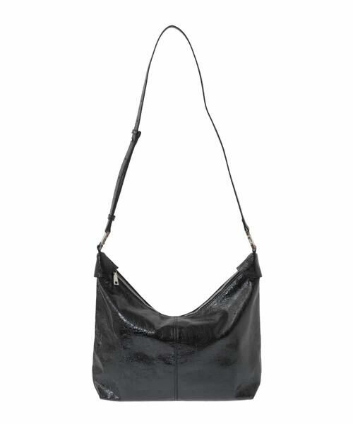 艶めく箔押しデザインがスタイリングにモードなインパクトをプラスするショルダーバッグ。カーブを描く上部が特徴的なスクエアフォルムのしっかりとした収納力も魅力です。ベルトを外してハンドバッグとしても使える2WAY仕様。シックなブラックと、メタリックに煌めくシルバーカラーの2色展開です。
