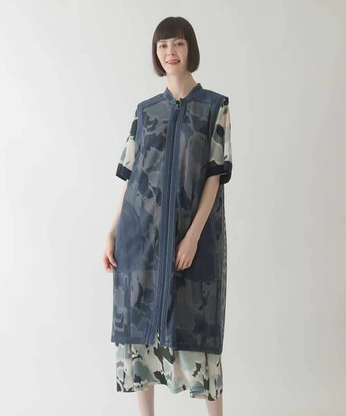 天然調のポリエステル糸で編まれたストレッチ性のあるメッシュ生地。麻調の布帛生地をジョイントしてよりナチュラルな雰囲気に仕立てました。