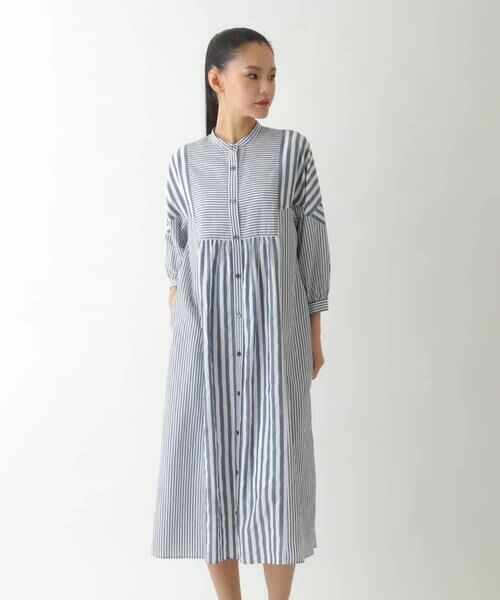 ナチュラルな雰囲気ながら、落ち感のあるテキスタイルでエレガントに仕立てたシーズナルな一着。太さの異なるストライプ柄をイレギュラーに配置した切り替えテクニックがポイントです。ウエストギャザーやバックタックで甘さを加えたふんわりと柔らかいシルエットが魅力的。※インナードレス付き