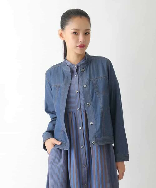 切り替えやパーツポイントに金茶ステッチを効かせたヒロコビスならではの一着。短丈の着回しやすいシルエットでブラウス感覚でも合わせて頂ける軽やかなお作りです。フロントスナップ式で楽に着脱出来、様々なボトムと好相性。フェミニン、カジュアル、スポーティーにと幅広く活躍してくれるアイテムです。同生地のワンピース【RBEJB02360】やパンツ【RBLJB04230】もおすすめ。